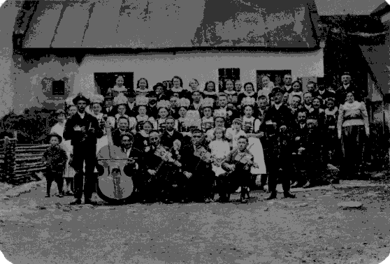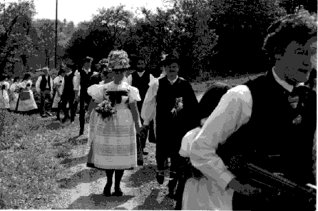 Der Hochzeitszug formierte sich nach Anweisungen des Brautführers im Hof, und zog, von der Fiedlerkapelle begleitet langsam durch das Dorf zur Kirche. Auf dem Weg zur aber auch von der Kirche wurde gelbgrüner